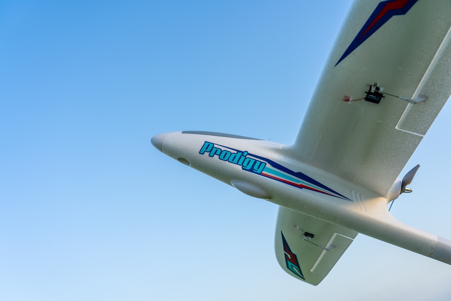 Built with ultralight tough EPO foam, the large wing area and high-winged airframe configuration gives the Prodigy low wing-loading and extraordinary amounts of lift, even at slow speeds.