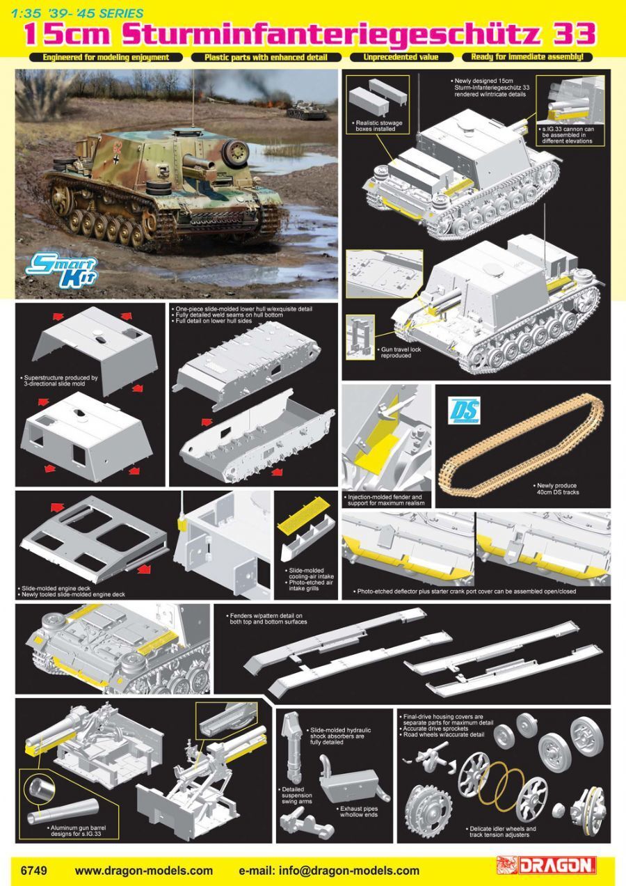 This kit by DML Dragon (China) comes in a large tray and lid type box. The box art shows a Stug. 33 from above, tooling down a heavily traveled road, that has lots of tank tread marks on it, between shell holes and a destroyed artillery piece. A side panel of the box gives a one-paragraph history of the vihicle in 6 languages, including English. The other side panel has 3 full color photos of the model made up, showing both sides and the rear.