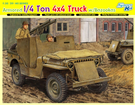 Following a very popular earlier release (Item No.6714), Dragon has produced another exciting 1/35 scale kit of a 1/4-Ton Armored 4x4 Truck. The difference is that it carries two bazookas instead of the original kit...s .50-cal machine gun. The twin bazookas are fitted on a pintle mount that...s newly tooled especially for this release. Such an improvised weapon installation was observed on scout jeeps during the Battle of the Bulge, for example. The vehicle features a solid one-piece body tub for accurate assembly and alignment. Under the hood is an extremely realistic-looking engine that assembles from multiple parts; it can be shown off if the modeler chooses to model the hood up. Atop the hood, the windscreen is depicted wrapped in a canvas cover. The new armor plates are rendered in photo-etched metal to give a true-to-scale appearance, while other metal components provide items such as tool mounting brackets, hood retainers and various straps. All in all, this is one extremely potent little vehicle!