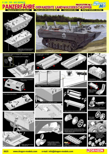 Dragon...s exciting new 1/35 kit depicts the very first prototype of the Panzerf..hre. The kit makes full use of the excellent and established set of parts from Dragon...s previous Panzer IV tank models ... for example, the wheels, suspension and tracks. Meanwhile, all other parts are brand new in line with the unique nature of this vehicle. Detail such as rivets on the hull is beautifully and delicately rendered, while widespread use is made of slide molds. Modelers will find this kit assembles easily, and that the finished item is a stunning vehicle that stands out in any model collection. For something unique, for something equally at home or in the water, the all-new Panzerf..hre from Dragon is an irresistible item!