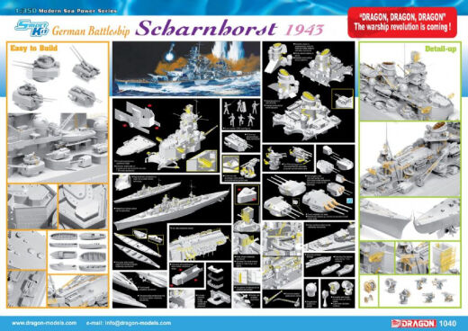 Dragon is proud to announce its most stunning ship kit ever šÂ¬ a 1/350 scale rendition of the famous German battleship Scharnhorst! The 31,500-ton Scharnhorst was commissioned on January 7 1939, and it often operated in partnership with its sister ship, Gneisenau. Buoyed by a top speed of 31.5 knots, this battleship wreaked havoc on Allied shipping with its nine 11-inch guns. It was involved in the invasion of Norway in 1940, during which it sank the British carrier HMS Glorious. In early 1941 the Scharnhorst and Gneisenau broke out into the Atlantic to lay siege to Allied shipping lanes. On December 25 1943, the Scharnhorst and accompanying destroyers put to sea to interdict Arctic convoys heading to Russia. However, aware of German plans, the British intercepted the Scharnhorst with a Royal Navy battleship, cruisers and destroyers. Reeling under multiple salvos of 2195 shells and 55 torpedoes, the Scharnhorst finally succumbed to its mortal wounds at 1945 hours on December 26. Of the 1968 crewmen aboard, only 36 survived. As an interesting footnote, the wreck of the Scharnhorst was discovered off North Cape in northern Norway in 2000.