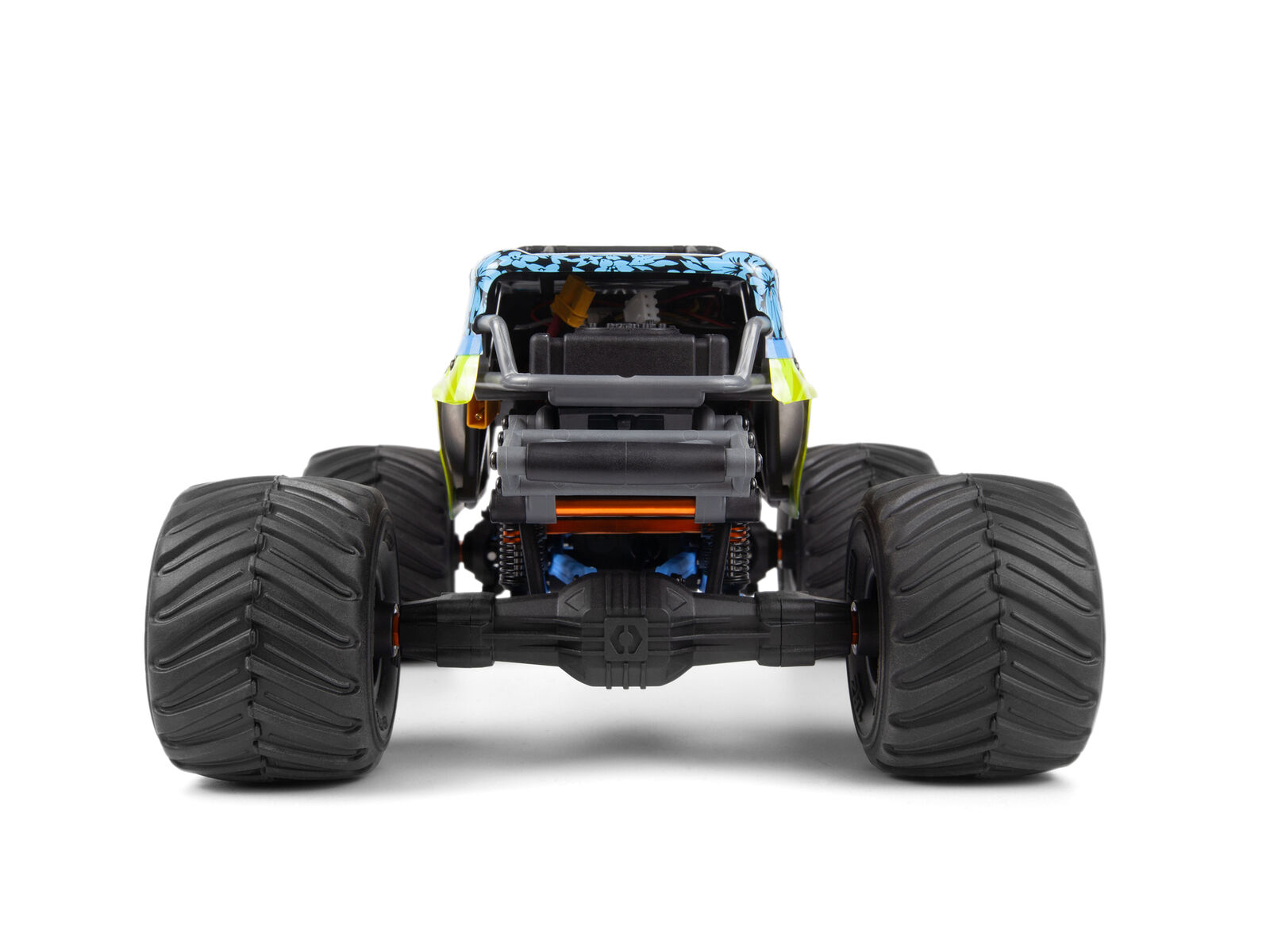 A tough TVP composite chassis, twin oil-filled shocks at all four corners, and massive new axle housings with three-gear differentials transform this truck into a compact powerhouse. A single-speed transmission drives counter-rotating CVD steel center shafts for smooth power delivery, while heavy-duty lower links and the officially licensed Big Kahuna body complete the transformation.