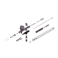 This is a unique, ultra-light alloy model. Featuring both needle travel adjustment and air flow and pressure control, this airbrush is ergonomically designed and original. Professionals will find that it provides complete accuracy and precision for detailed work. It features a dual independent action function with a gravity system and a floating nozzle system. It is easy to disassemble and clean. It includes a 0.2 and 0.3 needle/nozzle set, a 9 ml cup, and a quick disconnect hose coupling.