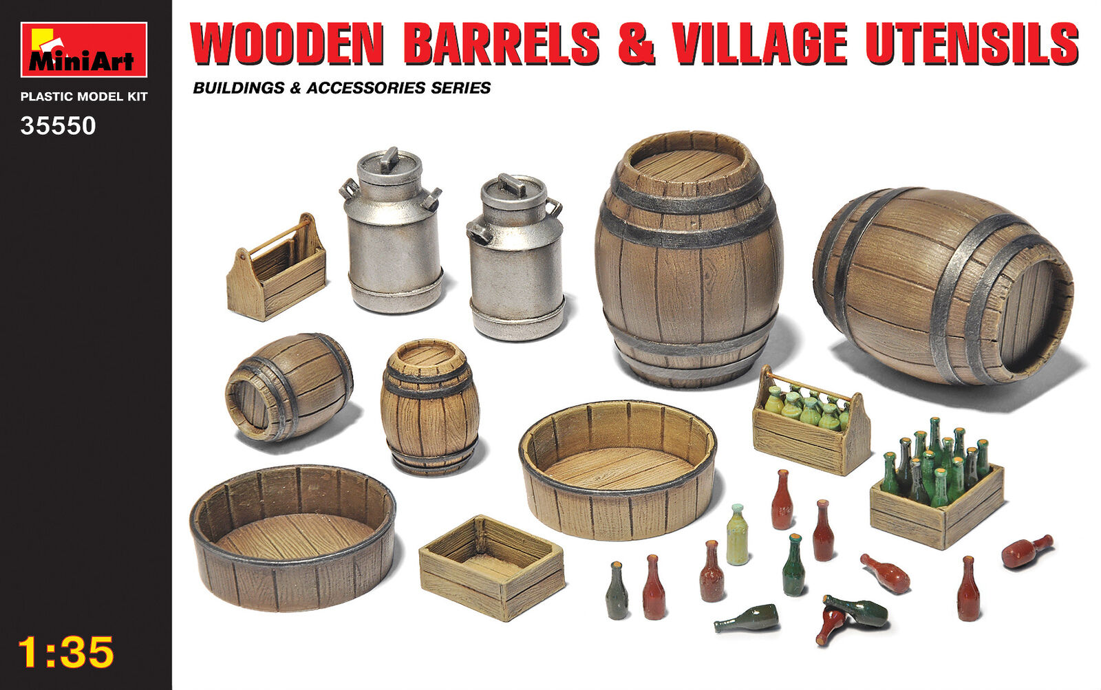 This kit contains unassembled and unpainted wooden barrels and village utensils.