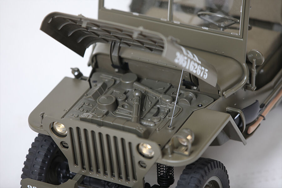Performance was not overlooked when creating the MB Scaler: a modern crawler chassis was chosen to retain the body-on-frame and solid axle design of the full scale MB. Oil filled shocks replace leaf springs to allow for axle articulation. Narrow wheels feature specially formulated high-grip tires with period-correct tread to provide maximum traction while retaining the scale look of the MB.