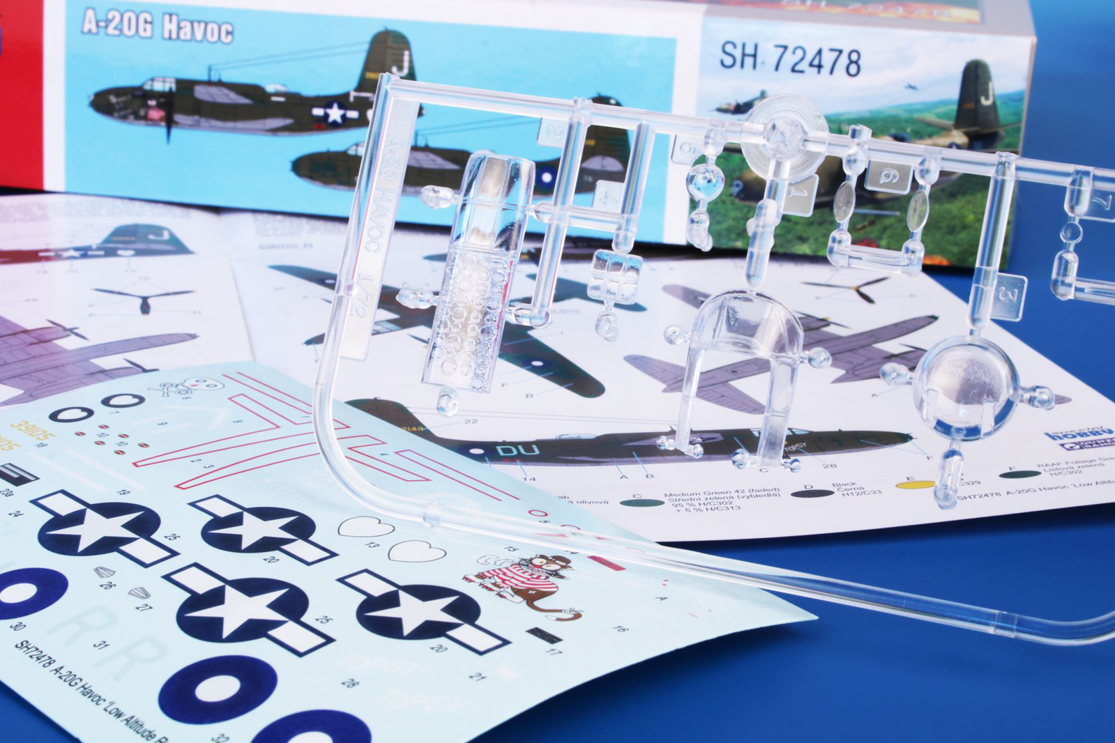 The kit offers nicely detailed A-20G parts broken up to XX grey styrene sprues plus one sprue with the clear parts. On top of that the kit also contains a sheet of decals covering two schemes, the US one with a quite interesting, hat-wearing cat painting on the nose and the other option portrays an Australian machine bearing a unique combination of US and RAAF national insignia.