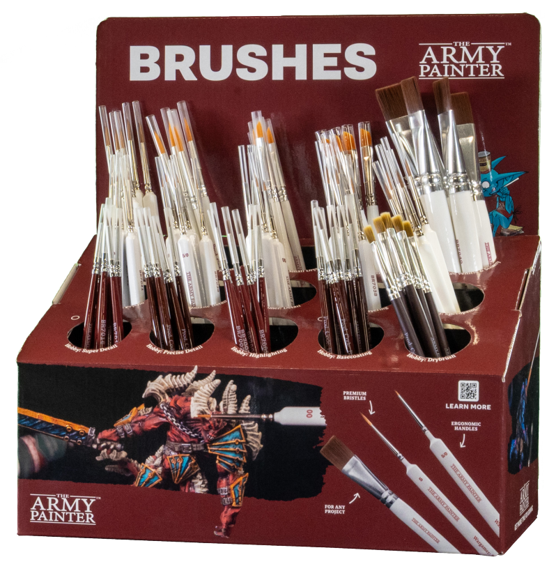 The Army Painter’s brush range and keeps your shop organized while driving easy add-on brush sales.